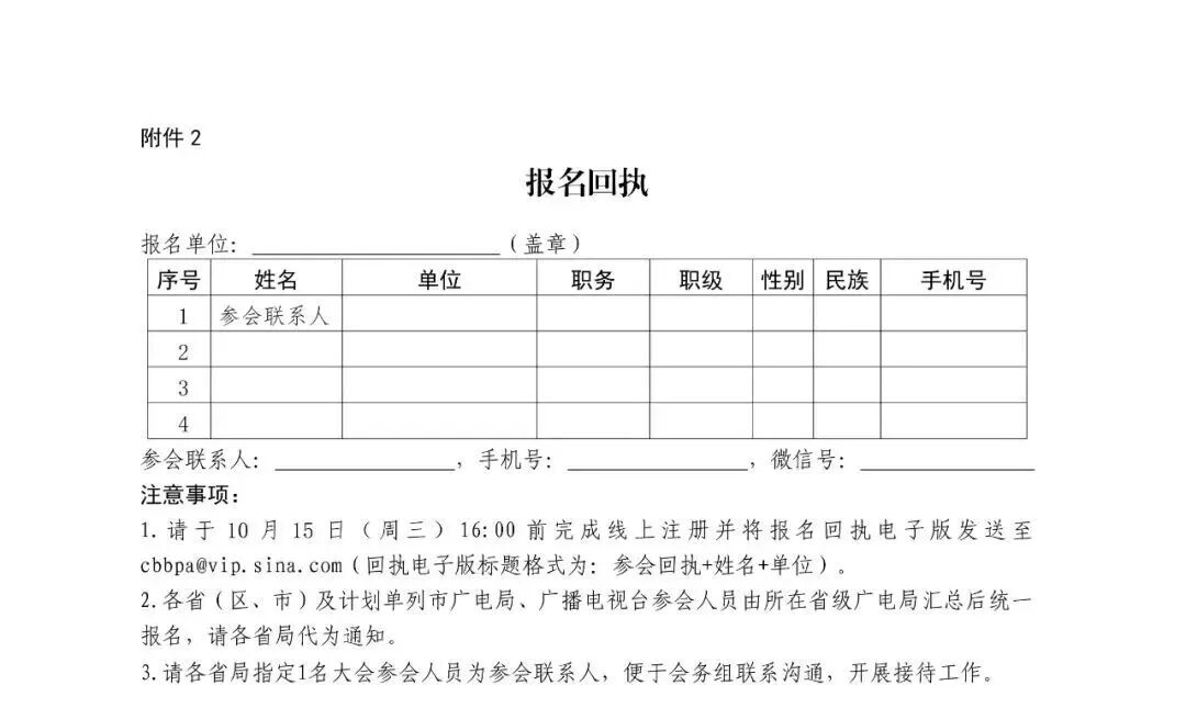 各单位请于10月15日(周三)16:00前完成报名和线上注册。各省(区、市)及计划单列市广电局、台参会人员,由所在省级广电局汇总后统一报名,请各省局代为通知,并报一名参会联系人。